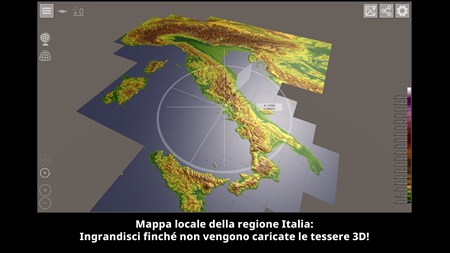 Puoi caricare 110 diverse regioni sul globo interattivo, che quindi presenta le numerose singole tessere in modo significativo e le carica automaticamente. L'app inizialmente contiene solo le trame per il globo in bassa risoluzione. Tutti i download richiesti vengono caricati automaticamente dal nostro server. Sono disponibili in totale circa 33 GB di dati. I dati rimangono nella cache del dispositivo per l'utilizzo offline, ma possono essere eliminati in qualsiasi momento nel menu principale. Inoltre, vengono inseriti nel globo tutti gli eventi registrati dal GDACS, come uragani, terremoti, ecc.
