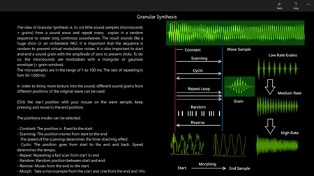 The Wave Granulator and the Granulator Synth lets you create wide orchestral sounds and ambient PADs and play them with an external MIDI Keyboard as a sound expander or with an internal touchscreen keyboard. You can also play MIDI song files with these sounds.