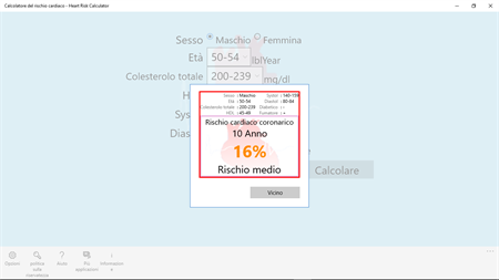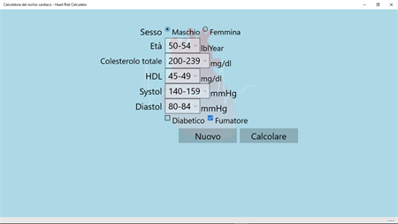 Questa applicazione è progettata per stimare il rischio negli adulti di età pari o superiore a 30 anni. Utilizzare l'applicazione Heart Risk Calculator per stimare il rischio a 10 anni. I fattori di rischio inclusi nel calcolo di Framingham sono sesso, età, colesterolo totale, colesterolo HDL, pressione arteriosa sistolica, ipertensione, fumo di sigaretta e diabete mellito.