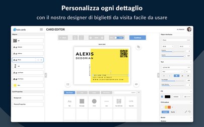 Con hub.cards puoi progettare e condividere biglietti da visita. Scegli tra fantastici modelli o crea il tuo proprio layout (sono incluse centinaia di icone, font e forme). Inoltre, scansiona i biglietti da visita fisici e organizza i tuoi contatti. Crea biglietti da visita digitali senza contatto - I biglietti da visita digitali sono eco-friendly. Sono sempre disponibili sul tuo dispositivo mobile o desktop quando ne hai bisogno, quindi non avrai mai bisogno di ordinarne altri. - Includi tutti i tuoi dettagli di contatto, i profili dei social media, le applicazioni di pagamento e molto altro sui tuoi biglietti da visita virtuali: sono completamente personalizzabili e le tue informazioni saranno sempre aggiornate. Condividi i tuoi biglietti da visita digitali con chiunque - Puoi condividere il tuo biglietto da visita digitale con chiunque, anche se non ha l'applicazione hub.cards. - Condividere il tuo biglietto da visita virtuale è possibile in molti modi: ad esempio QR-Code (stampato su un biglietto di carta, uno smartphone o uno smartwatch), e-mail, messaggio di testo, social media o un tag NFC. Puoi anche inviare a chiunque un link personalizzabile (ad esempio https://hub.cards/jane.doe) al tuo biglietto da visita. Privacy - La nostra politica sulla privacy assicura che le tue informazioni siano sicure e protette. - Come azienda tedesca, siamo soggetti alle leggi europee sulla protezione dei dati e usiamo solo server europei con i più alti standard. Informazioni su di noi L'applicazione per biglietti da visita digitali hub.cards è fatta con amore a Berlino, in Germania. Accogliamo i tuoi commenti! Inviaci un'e-mail a feedback@hub.cards.
