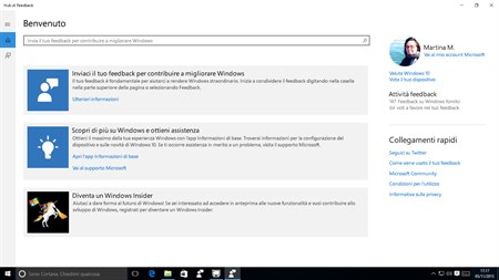 Aiutaci a migliorare Windows! Invia feedback su Windows e sulle app condividendo suggerimenti o problemi. Se vuoi partecipare ancora più attivamente, aderisci al Programma Windows Insider e resta aggiornato con avvisi e annunci, valuta le build, partecipa alle missioni di feedback e ottieni badge.