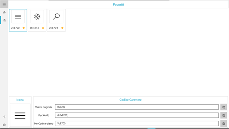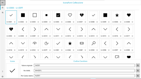 Il codice di carattere visualizza 3 stringhe; il valore originale, per XAML e per code-behind. Quando si preme il pulsante a destra della casella di testo, copiare la stringa negli Appunti. (Nota: quando la larghezza o l'altezza della finestra è inferiore 480epx, il pannello è nascosto.)
