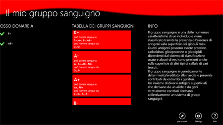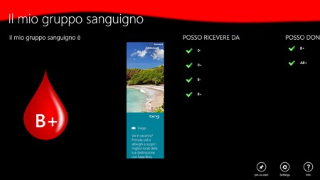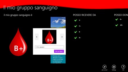 Memorizza il tuo gruppo sanguigno ed ottieni informazioni sulla compatibilità con tutti i tipi di sangue. Puoi inoltre aggiungere la tile personalizzata con il tuo gruppo alla schermata Start, per averlo sempre a portata di mano e non dimenticartelo. App universale: scarica anche la versione Windows Phone.