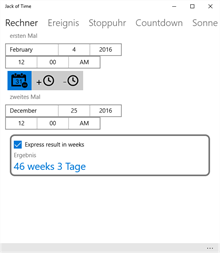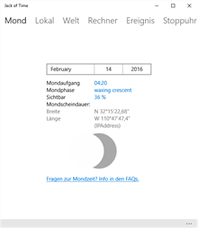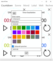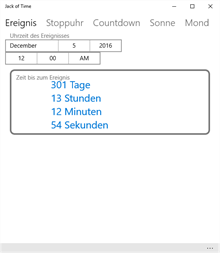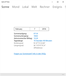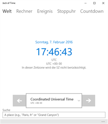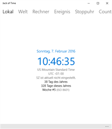Jack of Time offre una serie di funzioni correlate al tempo, tra cui un timer con conto alla rovescia, un cronometro, un calcolatore del tempo, orari di alba e tramonto, nonché funzioni correlate ai fusi orari del mondo.