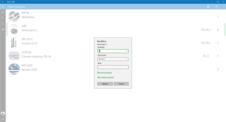 KaiMos è la soluzione aziendale ideale per gestire in modo semplice ed efficace i processi produttivi comprendo le aree della progettazione, acquisti, produzione, qualità, magazzino e controllo di gestione. KaimosApp WM è l’applicazione per la gestione del magazzino che ti permette di movimentare la merce in modo semplice e produttivo con il tuo pc desktop, tablet o smartphone utilizzando barcode reader Bluetooth per l’identificazione dei tuoi prodotti. Inoltre potrai consultare in completa mobilità le schede tecniche dei prodotti a magazzino, conoscere le loro ubicazione e le relative giacenze.