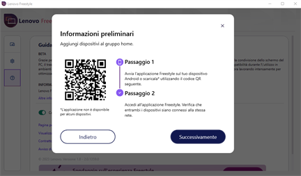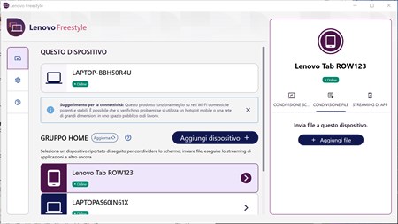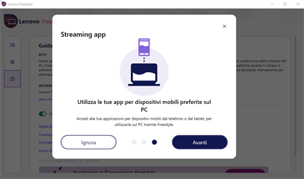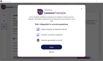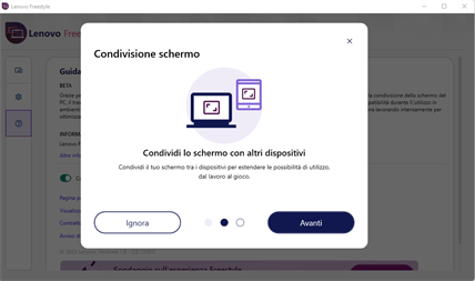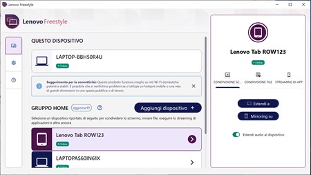 Lenovo Freestyle è dotato della tecnologia Collaborazione schermo intelligente che consente agli utenti di associare facilmente due dispositivi (attualmente i tablet Lenovo e un PC Lenovo con Windows 10 o 11) mediante un processo di associazione semplice e sicuro. Quindi è possibile estendere in modo continuo il desktop al tablet per ottenere uno schermo aggiuntivo o utilizzare il mirroring quando necessario.