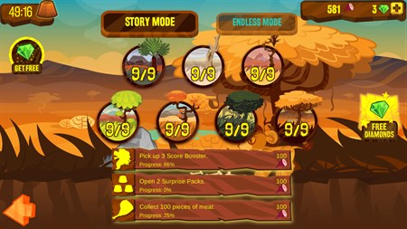 To win and become the king of the Africa you have to complete all the levels, collect food and develop Lion’s capabilities. Invite your friends to play with you and compare your scores. Be the best and complete 63 levels!