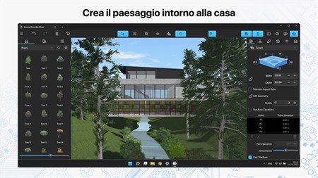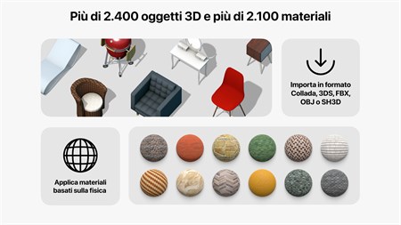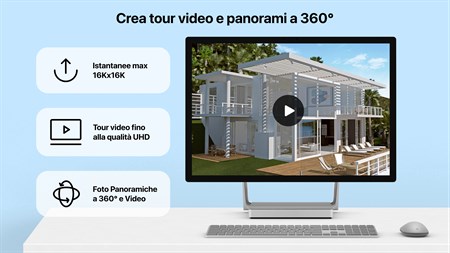 • Creare planimetrie dettagliate in 2D. • Fare tour degli interni in 3D. • Affinare le tue capacità di progettazione con modelli di case e interni già pronti (ad esempio cucine, bagni, soggiorni, ecc.). • Aggiungere e spostare mobili e altri oggetti (oltre 2400 articoli) e applicare materiali basati sulla fisica (oltre 2100 materiali disponibili). • Creare terreni elaborati con linee di elevazione e depressioni, progettare ingressi per auto, giardini o cortili.* • Importare modelli 3D da altre applicazioni in tutti i formati più popolari. • Raggiungere un'illuminazione naturale mediante l'impostazione di valori di geolocalizzazione, ora del giorno e nuvolosità. • Lavorare nella Vista elevazione 2D che mostra la vista laterale su muri e tetto; uno strumento perfetto per lavorare con aperture, nicchie e pannelli.* • Lavorare con il tetto personalizzabile, creare finestre ad angolo e aperture complesse. • Realizzare video di tour realistici di interni ed esterni con qualità di esportazione massima pari a Ultra HD.** • Creare video 3D stereo 360°, video a 360°, video a 360° 3D stereo e immagini JPEG panorama a 360°.** • Esportare l'intero progetto o diversi oggetti in formato FBX, glTF e OBJ. E tanto altro!**