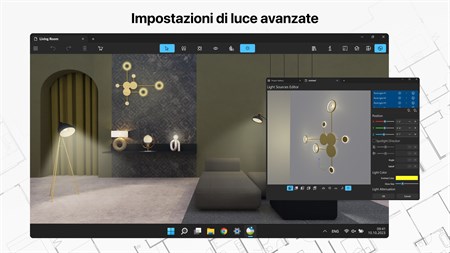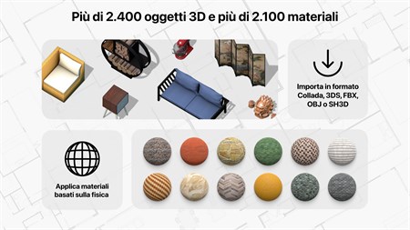 • Creare planimetrie dettagliate in 2D. • Fare tour degli interni in 3D. • Affinare le tue capacità di progettazione con modelli di case e interni già pronti (ad esempio cucine, bagni, soggiorni, ecc.). • Aggiungere e spostare mobili e altri oggetti (oltre 2400 articoli) e applicare materiali basati sulla fisica (oltre 2100 materiali disponibili). • Creare terreni elaborati con linee di elevazione e depressioni, progettare ingressi per auto, giardini o cortili. • Importare modelli 3D da altre applicazioni in tutti i formati più popolari. • Raggiungere un'illuminazione naturale mediante l'impostazione di valori di geolocalizzazione, ora del giorno e nuvolosità. • Lavorare nella Vista elevazione 2D che mostra la vista laterale su muri e tetto; uno strumento perfetto per lavorare con aperture, nicchie e pannelli. • Lavorare con il tetto personalizzabile, creare finestre ad angolo e aperture complesse. • Realizzare video di tour realistici di interni ed esterni con qualità di esportazione massima pari a Ultra HD. • Creare video 3D stereo 360°, video a 360°, video a 360° 3D stereo e immagini JPEG panorama a 360°. • Esportare l'intero progetto o diversi oggetti in formato FBX, glTF e OBJ. E tanto altro!
