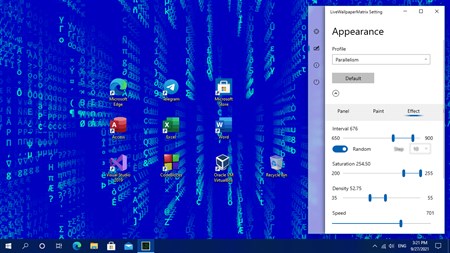 Sfondo animato per il tuo desktop che mostra il movimento di lettere, numeri e altri simboli nello stile del film Matrix con opzioni di personalizzazione dettagliate che ti consentono di creare profili di aspetto individuali.