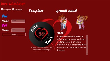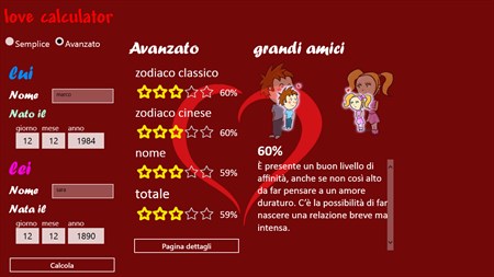 Love calculator è un'applicazione che ti permette di scoprire l'affinità amorosa fra due persone. Questo calcolo può essere eseguito nella modalità semplice (sulla base dei nomi) o nella modalità avanzata dove viene considerata l'affinità dei nomi e dei segni zodiacali tradizionali e cinesi.