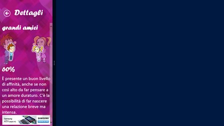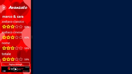Questo test amoroso è un gioco completamente gratuito, simile al famoso calcolatore di MTV. Ogni previsione amorosa è correlata da divertenti effetti visivi e sonori e da una descrizione in dettaglio.