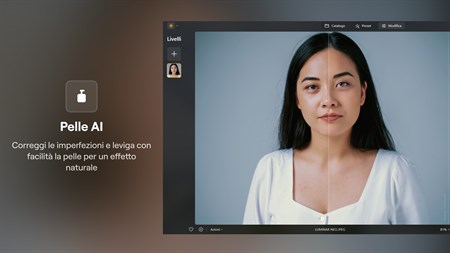 • Pelle AI: rileva automaticamente e rimuovi le imperfezioni della pelle, preservando al contempo texture e dettagli • Viso AI: ritocca con precisione i tratti del viso • Corpo AI: regola le proporzioni del corpo togliendo o aggiungendo volume al corpo di un soggetto per ottenere il look desiderato • Luce da studio: replica gli effetti di luce da studio con un tool che illumina le foto, senza bisogno di costose attrezzature da studio • Ritratto Bokeh AI: crea effetti bokeh nei ritratti grazie alla ricostruzione della profondità dell'immagine