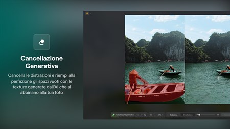 • Cancellazione Generativa: elimina le distrazioni e riempi alla perfezione gli spazi vuoti con gli elementi generati dall'AI che si abbinano all'area circostante • Espansione Generativa: estendi i confini delle tue foto e riempi il nuovo spazio con immagini realistiche generate dall'AI • Scambio Generativo: sostituisci elementi specifici delle tue foto con immagini generate dall'AI che si integrano alla perfezione con il resto dell'immagine