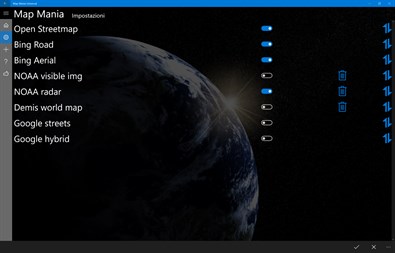 Map Mania consente di visualizzare le mappe del mondo in molti modi. Bing Maps, Openstreetmap e Google Maps sono già pronti all'uso, ma è anche possibile aggiungere le proprie mappe tramite un qualsiasi visualizzatore WMS. Grazie all'intuitivo menu principale, è possibile selezionare velocemente quali mappe mostrare sulla mappa. Inoltre, è possibile abilitare il tracciamento continuo della propria posizione, indicata da un puntino giallo lampeggiamente.