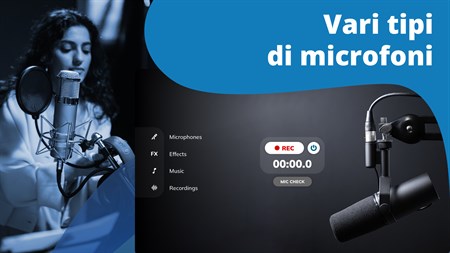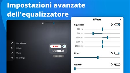 Applica diversi effetti per aggiungere più varietà all'audio - fa' suonare la tua voce spaziosa e lussureggiante, o più secca e calma. Aggiungi le tue tracce musicali e giocale in sottofondo durante le trasmissioni in diretta. Salva l'incisione che hai fatto e pubblicala o condividila sul web! L'applicazione offre funzionalità come il controllo del guadagno, la registrazione automatica, gli effetti audio, le impostazioni dell'equalizzatore, il controllo del microfono e molto altro.