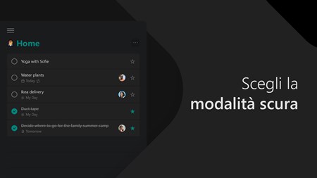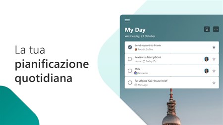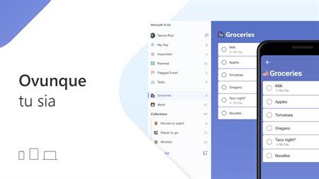 Con Microsoft To Do puoi: • Restare concentrato con My Day, una pianificazione giornaliera personalizzata con attività suggerite • Accedere ai tuoi elenchi ovunque e su qualsiasi dispositivo • Condividere gli elenchi e le attività con amici, familiari, colleghi e compagni di classe • Creare elenchi contraddistinti da colori • Impostare scadenze singole o ricorrenti e promemoria • Suddividere le attività in fasi gestibili • Aggiungere note alle attività • Allegare file fino a 25 MB a qualsiasi attività • Sincronizzare le attività tra Outlook e To Do To Do ti aiuta a organizzare e a semplificare i tuoi piani in ambito lavorativo, scolastico o domestico. To Do è gratuito e disponibile su tutti i tuoi dispositivi.