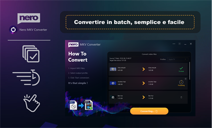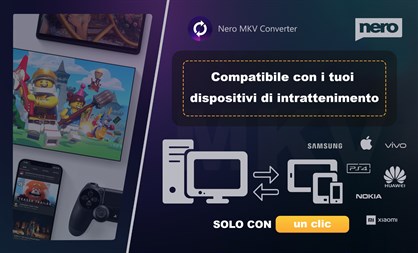 Il convertitore MKV più semplice, ora con la possibilità di incorporare i sottotitoli esterni! ATTENZIONE: nella versione gratuita alcune funzioni sono limitate, come la durata e la risoluzione del video. Prova la versione Premium: hai 7 giorni di prova gratuiti per provare tutte le funzioni. - Non sai come guardare film in formato MKV con sottotitoli esterni sulla TV? - Il tuo dispositivo non riesce a riprodurre un video MKV che hai scaricato? - Vuoi semplicemente rendere i file MKV compatibili con il tuo canale YouTube o iPad/iPhone? - I termini tecnici complicati di altri convertitori ti confondono? - Vuoi un file della massima qualità con dimensioni minime? Usa i file più compatibili per i tuoi dispositivi per l'intrattenimento, per condividerli sul web e molto altro - [NOVITÀ] Integra i sottotitoli esterni nei video - [NOVITÀ] Seleziona e converti tracce audio multiple - Converti file MKV in un formato compatibile con dispositivi per l'intrattenimento, iPad, PSP, dispositivi Android e molti altri. - Seleziona rapidamente il profilo di destinazione per ottenere la migliore qualità con dimensioni minime - Sfrutta la potente scheda grafica per migliorare le prestazioni della conversione video - Conversione multipla: converti diversi file video MKV contemporaneamente - Semplice e veloce Ricorda: MKV è un formato di contenitore che può includere un'ampia gamma di codici audio e video. A seconda della configurazione del sistema, alcuni potrebbero non essere supportati come input (ad esempio formati audio basati sugli oggetti o codec video meno comuni). Prima di effettuare l'acquisto, sfrutta il periodo di prova per assicurarti che tutti quelli che cerchi siano supportati.