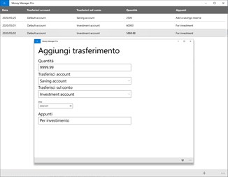 【Trasferisci transazione】 Aggiungi e modifica le transazioni di trasferimento tra account. È possibile cercare i record delle transazioni di trasferimento entro due intervalli di date.