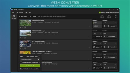• Enable hardware acceleration to save time. • Auto shutdown when completed. • Save time with multiple files processed at once or focusing on a single video. • Keep PC awake while processing.