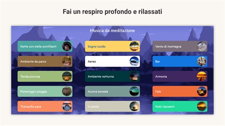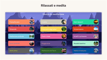 Suoni di mediazione ad alta definizione: ★ Lago tranquillo ★ Gentile Mattina ★ Alba ★ Guarigione dei chakra ★ Suoni del paradiso ★ Pioggia perfetta ★ Viaggio magico ★ Foresta d'autunno ★ Suoni del convento ★ Relax al mare ★ Tempio nei Suoni delle Colline ★ Musica mistica del tempio ★ Notte d'estate ★ Campagna ★ Oceano tropicale ★ Notte con stelle scintillanti ★ Sogno Lucido ★ Vento di montagna ★ Ambiente del parco ★ Suoni dell'aeroplano ★ Suoni del caffè