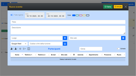 Organizza i tuoi appuntamenti e riunioni in un'agenda con visualizzazione mensile, settimanale, giornaliera e elenco degli eventi. Registra per ogni evento il titolo, la descrizione, il colore, i partecipanti, il luogo, l'indirizzo web e i file allegati. Salva il codice o il link per unirti alla riunione online (Google Meet, Microsoft Teams o Zoom). Trascina e rilascia gli eventi facilmente. Molto intuitivo.