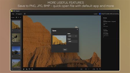 + Quickly view NEF. + Manage your NEF library. ++ Open file with default app. ++ Reveal file in File Explorer. + Save file to PNG, JPG, BMP with resize option.