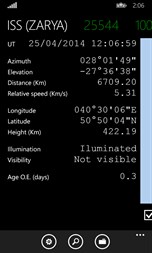 You can also access a specific satellite either by its name or NORAD number. Once selected, coordinates and its position on a map are showed in real time. If you have a compass and accelerometer , the application can help you to locate the satellite. The application can search for the passes of the satellite above the horizon that will occur in the coming days.