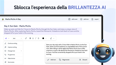 Sblocca la brillantezza dell'AI: – Accendi la tua creatività con le meraviglie dell'intelligenza artificiale! Chiedi all'intelligenza artificiale risposte immediate, lascia che continui i tuoi pensieri senza soluzione di continuità, tragga conclusioni rapide e abbellisca il tuo stile di scrittura. – Cambia il tono del tuo testo in un attimo, correggi la grammatica senza sforzo, ottieni versioni concise con Accorcia testo ed esplora layout dinamici con Colonne di testo. – Crea parole che affascinano e lasciano un'impressione duratura