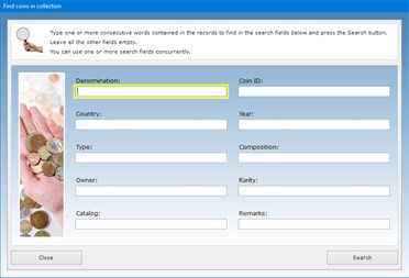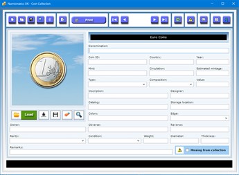 The data to be entered in the text fields concern the coin denomination, its identification code, country of origin, the mint where the coin was manufactured, the year the coin was minted, the period of circulation, the estimated mintage (i.e. the quantity of coins produced), the coin type (circulating coin, commemorative coin, collection coin), its composition (alloy, aluminium, brass, bronze, copper etc.), value, inscription, designer, catalog, storage location, colors, edge (decorated, grooved, lettered, plain, reeded, security), a description of its obverse and reverse sides, the coin rarity information (from R-1 to R-10), the coin condition (from Good to Mint State), its weight, diameter and thickness.