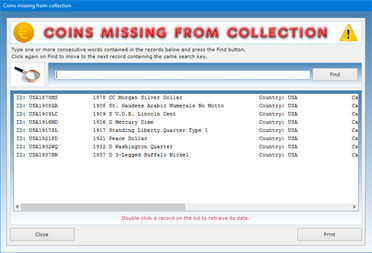 The software allows you to carry out advanced searches in the database even using a partial search key, that is, indicating one or more consecutive words contained in any text field. For each search you can refer to one or more fields at the same time. For example, you can obtain a list of all the coins of a certain composition, belonging to the same owner, minted in a certain year and so on.