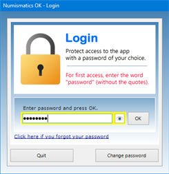Access to the software is protected by a user-customizable password that can be changed as often as desired. For the first access to the software, you must use the keyword "password" (written without the quotation marks). If you forget your password, send an e-mail to the author of the software at info@espositosoftware.it using the sentence "Forgot login password for Numismatics OK" as a subject line. In response to your e-mail, you will receive instructions to reset your password.