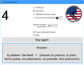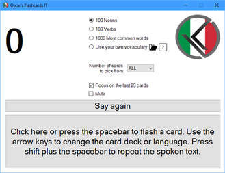 With Oscar's Flashcards for Italian, you can improve your vocabulary. You can start with 100 of the most common nouns and verbs and then move to 1000 of the most commonly used words.