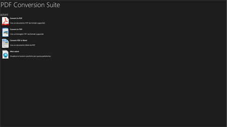 PDF Conversion Suite crea PDF o TIFF partendo da documenti di diversi formati. Può anche convertire i tuoi file in PDF in documenti di Microsoft Word (.docx). Devi solo selezionare l'azione scelta e il documento di partenza per iniziare il processo di conversione.