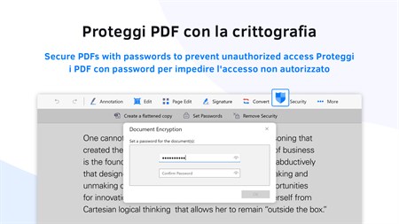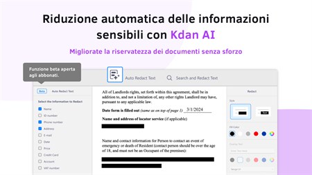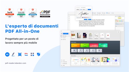 "KDAN PDF Reader è l'alternativa intelligente ad Acrobat Adobe PDF. Dotato di tecnologia AI, KDAN PDF Reader è una potente soluzione PDF per PC Windows, iOS, Android e Mac. Diventate esperti di PDF: utilizzate PDF Reader per annotare, modificare, combinare, convertire, crittografare e firmare documenti PDF. A scuola, al lavoro, a casa o in viaggio. Con KDAN PDF Reader, potrete sempre gestire documenti PDF complessi. Godetevi le funzionalità di modifica dei PDF su tutti i vostri dispositivi. **Nuove funzioni AI** - Auto Redact Text (Beta): Proteggete i vostri dati senza sforzo. Utilizzate la tecnologia AI per rilevare e correggere le informazioni sensibili nei documenti. Ideale per i settori che gestiscono costantemente informazioni sensibili, come l'istruzione, la legge, la finanza, la pubblica amministrazione, la sanità e altri ancora. La funzione Beta è disponibile esclusivamente per gli ""abbonati a Document 365"" in PDF Reader Windows. Non siete ancora abbonati? Iniziate la vostra prova gratuita di 7 giorni ed esplorate le nuove funzionalità. La campagna di prova Beta termina a metà aprile. - Traduzione istantanea: Leggere e comprendere facilmente i contenuti PDF. Traducete rapidamente il testo in oltre 100 lingue. È possibile modificare e salvare facilmente la traduzione. PREMI E RICONOSCIMENTI - I migliori prodotti software per l'ufficio per il 2024 secondo G2 - L'implementazione più rapida e la facilità di fare affari per le piccole imprese secondo G2 nell'inverno del 2024. - Le migliori app di lettura PDF per il 2020 by Tom's Guide - Consigliato da Techradar, Techworm, Softonic e Waerfa - In evidenza su G2, Capterra e SourceForge CARATTERISTICHE CHIAVE EDIT PDF - Sostituite, modificate, aggiungete o eliminate il testo direttamente nei PDF. - Modificare, ritagliare e regolare le immagini nei PDF - Inserire immagini nei PDF - Compilazione e modifica di moduli PDF - Modificare la dimensione e il colore dei caratteri OCR PDF - Riconoscere ed estrarre il testo dai PDF - Esportazione dei risultati OCR come testo o PDF ricercabile - Oltre 50 lingue supportate PDF SICURO - Riduzione del testo (ricerca o intelligenza artificiale) - Aggiungere password per bloccare i PDF - Rimuovere le password dai PDF CONVERTIRE PDF - Supporto del convertitore integrato e del convertitore cloud - Supporta conversioni da PDF a Word, Excel, PPT, testo, immagini e eBook (docx, xlsx, pptx, png, txt, rtf, ePub, AZW3 e MOBI). VISUALIZZA I FILE - Cambiare il colore dello sfondo del PDF - Presentare un PDF come presentazione - Visualizzate e convalidate i certificati e le firme nei documenti PDF. - Visualizzazione di più PDF come schede - Visualizzazione del PDF a pagina singola o a doppia pagina - Visualizzazione di file PDF come testo normale (text reflow) - Scorrimento orizzontale o verticale, modalità di scorrimento a pagina singola o continua. - Ricerca di testo nei PDF - Visualizzare un PDF in modalità a schermo intero EDITORE DI PAGINA - Ruotare, eliminare, aggiungere e riorganizzare le pagine - Estrarre pagine da PDF FIRMARE E SCRIVERE SUL PDF - Firmare contratti e accordi con firma - Creare e gestire firme dall'interno della libreria - Aggiungere note scritte a mano ai PDF (integrato con Windows Ink) ANNOTARE E RIVEDERE PDF - Annotate i PDF con evidenziazioni, sottolineature, cancellazione di testo, forme, note adesive e caselle di testo. - Aggiungete timbri predefiniti, tra cui Approvato, Firma qui, Riservato e altri ancora. - Aggiungere timbri personalizzati con informazioni su data e ora - Inserire collegamenti ipertestuali a siti web esterni, pagine di destinazione e indirizzi e-mail. - Inserire immagini nei PDF - Appiattite tutte le annotazioni prima di condividerle GESTIRE I FILE - Zip e decompressione dei file - Unire più file in un unico PDF - Dividere un PDF grande in più PDF piccoli - Inviare fax direttamente dall'applicazione - Condividete i documenti come PDF appiattiti o PDF annotati con gli altri. OPZIONI DI ABBONAMENTO Sbloccate l'esperienza completa di PDF Reader con un abbonamento a Document 365 per telefono, tablet, PC e Mac. DOCUMENT 365 (accesso a tutte le piattaforme, 1 TB di storage Kdan Cloud incluso) - Piano annuale: addebitato annualmente a 59,99 dollari/anno al termine dei 7 giorni di prova. - Piano trimestrale: fatturazione trimestrale a $19,99/trimestre dopo la fine dei 7 giorni di prova. LICENZA A VITA (sblocca l'applicazione Windows senza servizi cloud) - Licenza permanente: acquisto una tantum per USD$119.99 (supporta solo le conversioni da PDF a TXT e PNG). Gli abbonamenti saranno addebitati sul conto Windows al momento della conferma dell'acquisto. Non è consentita la cancellazione dell'abbonamento in corso durante un periodo di abbonamento attivo. Termini di servizio: https://pdf-reader.kdandoc.com/terms-of-service Informativa sulla privacy: https://pdf-reader.kdandoc.com/privacy-policy Avete una domanda? Contattateci all'indirizzo helpdesk@kdanmobile.com o consultate il sito https://support.kdanmobile.com ."