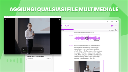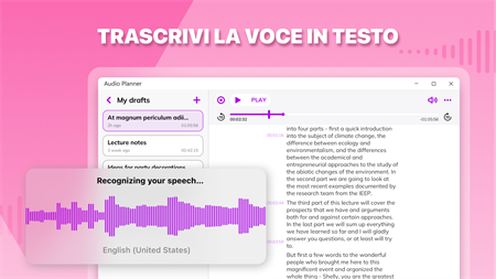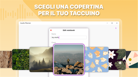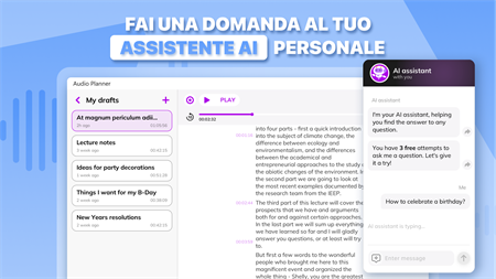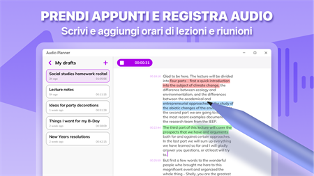 Crea note vocali e di testo semplicemente facendo clic sul pulsante REC! Agenda audio è uno strumento universale per la registrazione di lezioni e riunioni, riconoscimento vocale istantaneo, traduzione e persino tenere un diario personale. REGISTRAZIONE FACILE Crea una nota e inizia a registrare. Metti in pausa quando necessario e torna più tardi: la registrazione audio continuerà dal punto in cui l'hai interrotta. Segui le tue note per timestamp vicino a ogni paragrafo, in modo da non perderti! RICONOSCIMENTO DEL DISCORSO Parla, traduci, salva. La tecnologia AI lascia riposare le dita mentre prendi appunti. L'app converte automaticamente il parlato in testo e lo traduce in qualsiasi lingua. IMPORTAZIONE VIDEO E AUDIO Allega file musicali e video alle tue note: rendile più luminose e rappresentative! Taglia i tuoi allegati se hai bisogno di includere alcune parti. BELLISSIMO DISEGNO Usa graziosi sfondi e copertine per taccuini e goditi le tue note personalizzate. Ordina i tuoi taccuini per categorie e temi. Detta e cattura. Raccogli i tuoi pensieri e organizza il tuo lavoro e la tua istruzione a tuo agio. Tieni presente che alcune funzionalità potrebbero essere disponibili solo con un abbonamento: - convertire il parlato in testo; - taglio dell'audio; - note illimitate; - tutte le copertine dei quaderni; - accesso illimitato all'assistente AI. La versione gratuita offre: - 10 note; - 3 tentativi gratuiti per porre una domanda all'assistente AI; - accesso limitato alle copertine dei notebook.