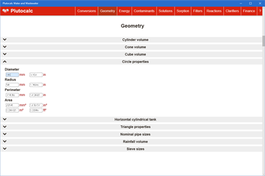 Geometry - Buffer tank capacity - Cylinder volume - Cone volume - Cube volume - Circle properties (radius, diameter, perimeter and area) - Horizontal cylindrical tank volume - Triangle properties with sides/angles determination - Municipal plants flow estimation - Nominal pipe sizes and wall thickness - Sieve sizes according - Rainfall volume