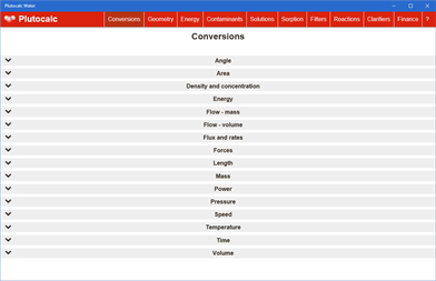 Conversions - Angle - Area - Conductivity and resistivity - Density and concentration - Energy - Flow - mass - Flow - volumetric - Flux and rates - Forces - Hardness in water - Length - Mass - Power - Pressure - Speed - Temperature - Time - Volume