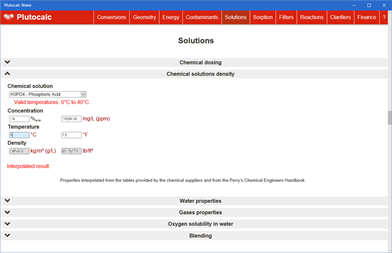 Solutions - Chemical dosing flow, mass and concentrations - Dry chemical dosing flow - Chemical solutions density database - Water properties (viscosity, density) - Gases properties (density and molecular weight) - Oxygen solubility in water - Multiple streams blending - Specific gravity, Baumé, Brix and API relations