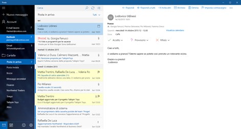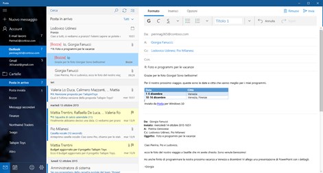 Con le app Posta e Calendario puoi mantenere aggiornata l'email, gestire la pianificazione e restare in contatto con le persone che ti interessano. Puoi usare queste app sia al lavoro che a casa, per comunicare rapidamente e concentrare l'attenzione sugli aspetti più importanti usando tutti i tuoi account. Sono supportati gli account Office 365, Exchange, Outlook.com, Gmail, Yahoo! e altri account noti.