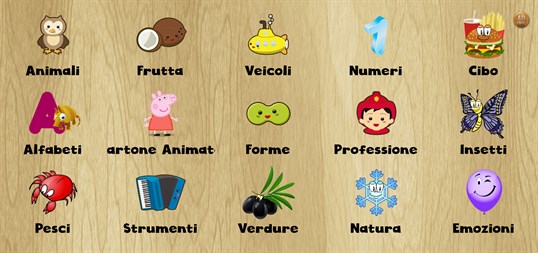* Animali: scoiattolo, panda, ape, scimmia, gallina, anatra, pinguino, elefante, leone, gufo, cane e molti altri simpatici animali. * Frutta: ananas, limone, mela, fragola, banana, ciliegia, pera, anguria, cocco ecc. * Verdure: carote, mais, peperoni, ravanelli, melanzane, cavolfiori, olive nere, cavoli, peperoncino ecc. * Numeri: 1, 2, 3, 4 fino a 10 * Alfabeti: A, B, C, D fino alla Z * Insetti * Prodotti alimentari * Pesci * Veicoli * Cartoni animati * Forme * Professione * Strumenti * Natura * Emozioni