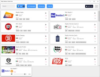 Questa app per stazioni free radio online offre centinaia di stazioni radio che coprono tutte le varietà e classi di contenuti che sono già attive per lo streaming quando le desideri. Include sia le radio ospitate su Internet che alcune stazioni FM che supportano lo streaming online. Inoltre, nonostante ascolti alcune stazioni radio free specifiche e tradizionali, questa stazione radio online di prim'ordine ti consente di creare le tue stazioni. Puoi farli attorno al tuo artista, al tipo di musica o persino alle canzoni più amati e speciali. Infine, questa app per stazioni radio online ti farà impazzire con le sue fantastiche e sempre apprezzate funzionalità. La tua attesa è finita ora e l'app è davanti a te. Ora scarica l'app sul tuo desktop, laptop, tablet o telefono cellulare per goderti le migliaia di stazioni radio del mondo gratuitamente. Gli utenti di tablet hanno bisogno di Windows 10 per utilizzare questa app sui propri tablet. Spero che apprezzerai questa nuova app per stazioni radio online. Questa è un'app impeccabile ma "errare è umano", quindi il team è pronto ad accogliere i tuoi preziosi suggerimenti per aggiornare e rendere questa app più utile per te.