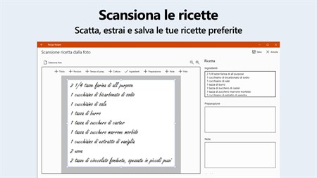 SCANSIONE DA LIBRI DI CUCINA, RIVISTE E RICETTE SCRITTE A MANO Scansiona le ricette utilizzando la fotocamera del tuo telefono o dalle tue foto e file PDF esistenti. La tecnologia OCR converte automaticamente le immagini in testo. Conserva tutte le tue ricette di famiglia preferite al sicuro per sempre.