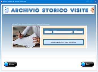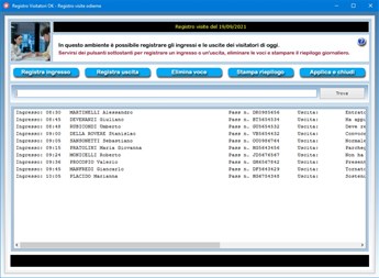 Il pulsante Stampa riepilogo permette di ottenere su carta l'elenco completo delle entrate e delle uscite registrate nella giornata corrente. Per salvare il registro delle visite odierne, è sufficiente uscire dalla schermata di lavoro premendo il pulsante Applica e chiudi.