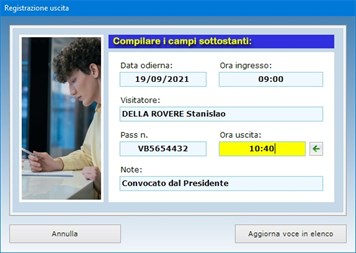 Nel momento in cui il visitatore torna alla reception per riconsegnare il pass e lasciare la struttura, bisogna selezionare il suo nominativo nell'elenco dei visitatori, premere il pulsante Registra uscita, indicare l'ora di uscita facendo clic sull'icona della freccia presente a destra del corrispondente campo di testo e, infine, premere Aggiorna voce in elenco. Si tenga presente che, all'atto della rilevazione dell'uscita, è possibile apportare eventuali modifiche, correzioni o integrazioni ai dati che sono stati inseriti in fase di registrazione dell'ingresso.