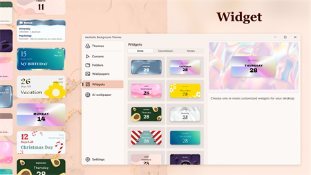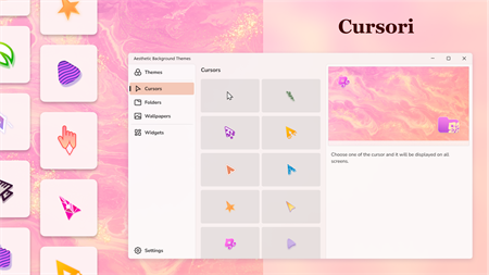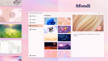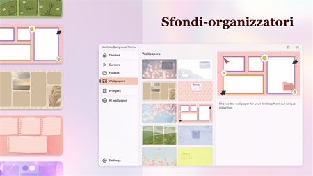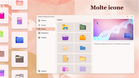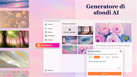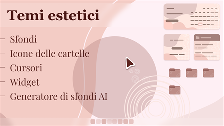 Annoiato dal design ordinario del sistema? Crea bellissimi temi personalizzati per il tuo desktop per renderlo unico e originale. Scegli sfondi, icone delle cartelle, widget ed effetti del cursore dalla nostra collezione. Impostali su un elemento particolare o sull'intero desktop.