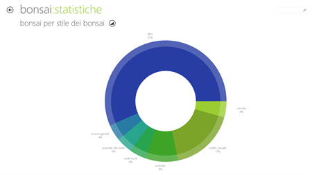 È inoltre possibile utilizzare le funzioni statistiche che forniscono una rappresentazione grafica di dati come un grafico a barre o a ciambella (ad esempio, mostra la distribuzione dei tipi di bonsai o degli stili bonsai nella vostra collezione).
