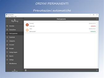 - Nessuna pubblicità! - Funzionamento semplice ed intuitivo - Gestione e valutazione delle spese e delle entrate - Gestione di transazioni, categorie, conti e cambio di prenotazione - Gestione delle spese e delle entrate ricorrenti - Filtro dati, ordinamento, raggruppamento e aggregazione - Protezione tramite PIN, Touch ID, Face ID - Input vocale e output vocale - comandi vocali - 5 colori per il design delle app - Importazione di transazioni CSV - Esportazione CSV di transazioni - Funzione di stampa - budget * - Gestione delle entrate, degli obiettivi di risparmio e delle liste della spesa * - Backup e ripristino dei dati * - sincronizzazione dei dati * - crittografia dei dati * - Convertitore di valuta (tassi di cambio correnti) *