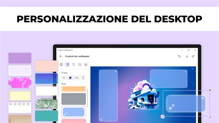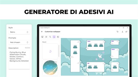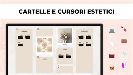 PERSONALIZZAZIONE DEL DESKTOP - scegli lo SFONDO, le icone della CARTELLA e gli effetti del CURSORE; - cambia la dimensione dello sfondo; - modifica il modulo delle cartelle; - aggiungi testo e modifica caratteri, colore e dimensione; - aggiungi ADESIVI GENERATI utilizzando l'intelligenza artificiale; - aggiungi le tue immagini.