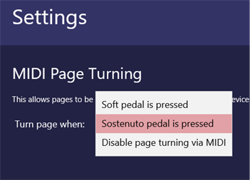 Connect to a digital piano (or other MIDI device) to turn pages via a pedal press.